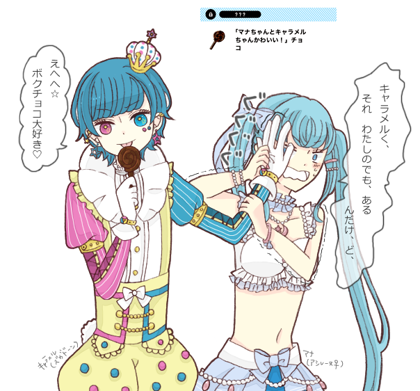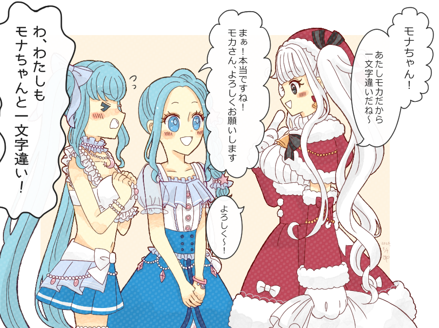 「モナちゃんのそのブレスレット、わたしのと同じのだよね!?へへっこれおみやげにもらったんだ~おそろいだねっ!」