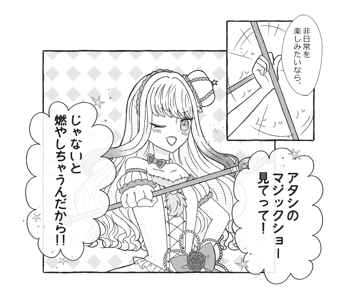 「非日常を楽しみたいなら、アタシのマジックショー見てって!じゃないと燃やしちゃうんだから!」