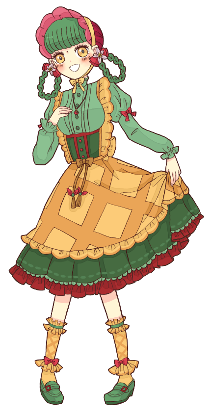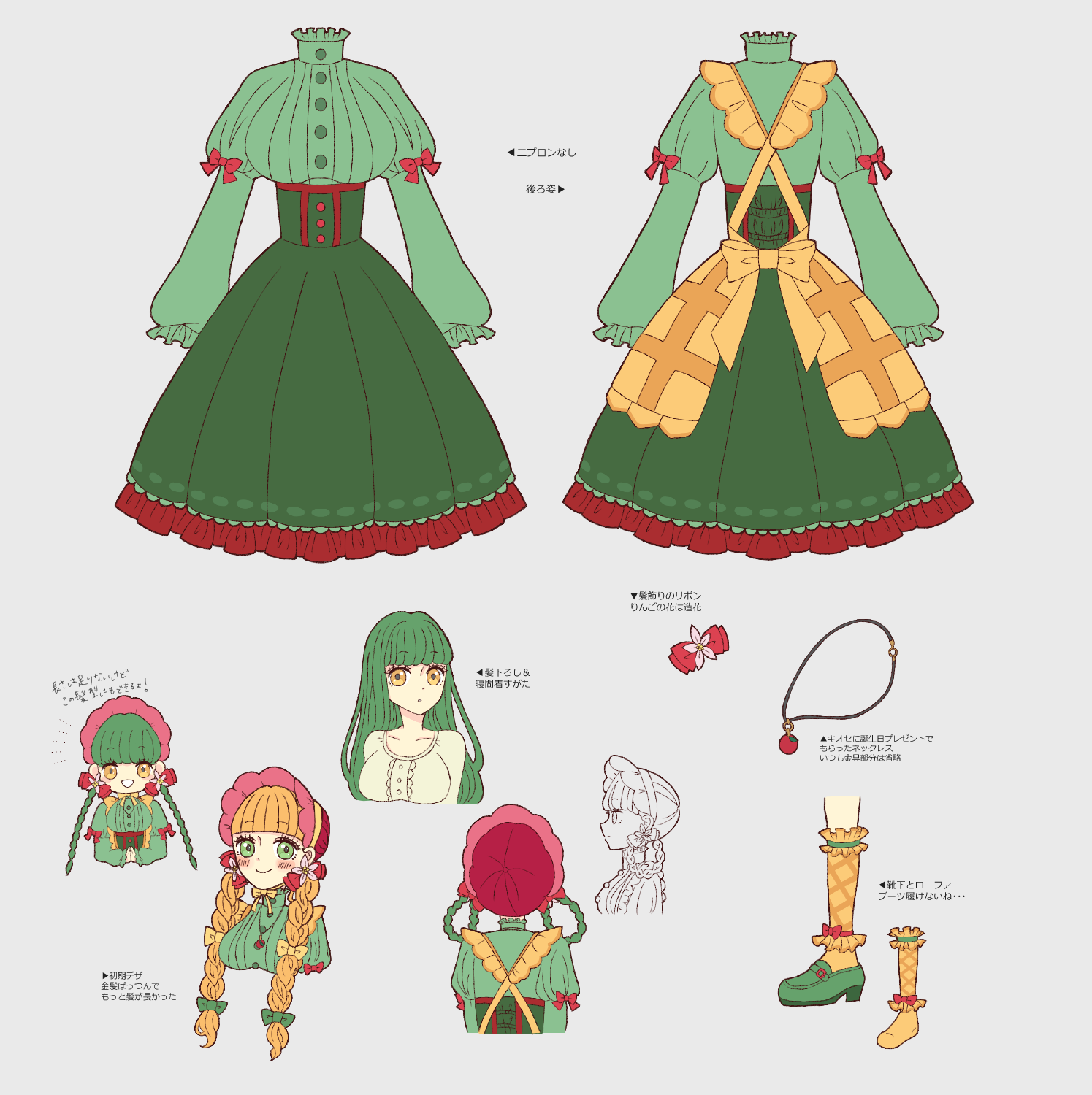 緑のハイウエストスカートにエプロン着用。数年この服しか着てないので5つくらい同じ服を持っている。